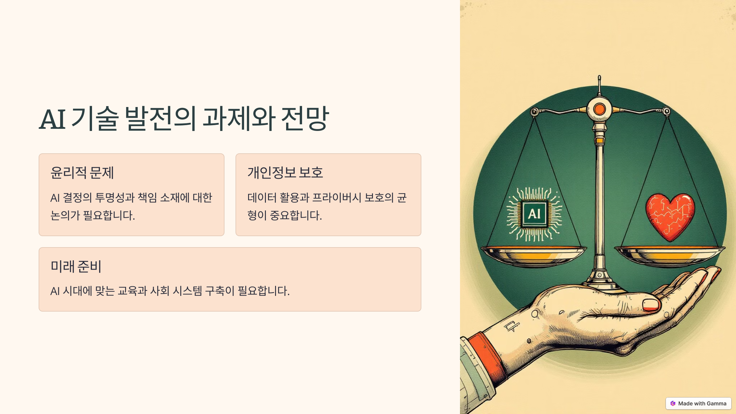 AI 기술의 발전은 우리 삶에 편리함을 제공함과 동시에 새로운 도전과 기회를 가져올 것입니다. 앞으로의 변화에 유연하게 대응하며 긍정적인 미래를 함께 만들어가길 바랍니다.