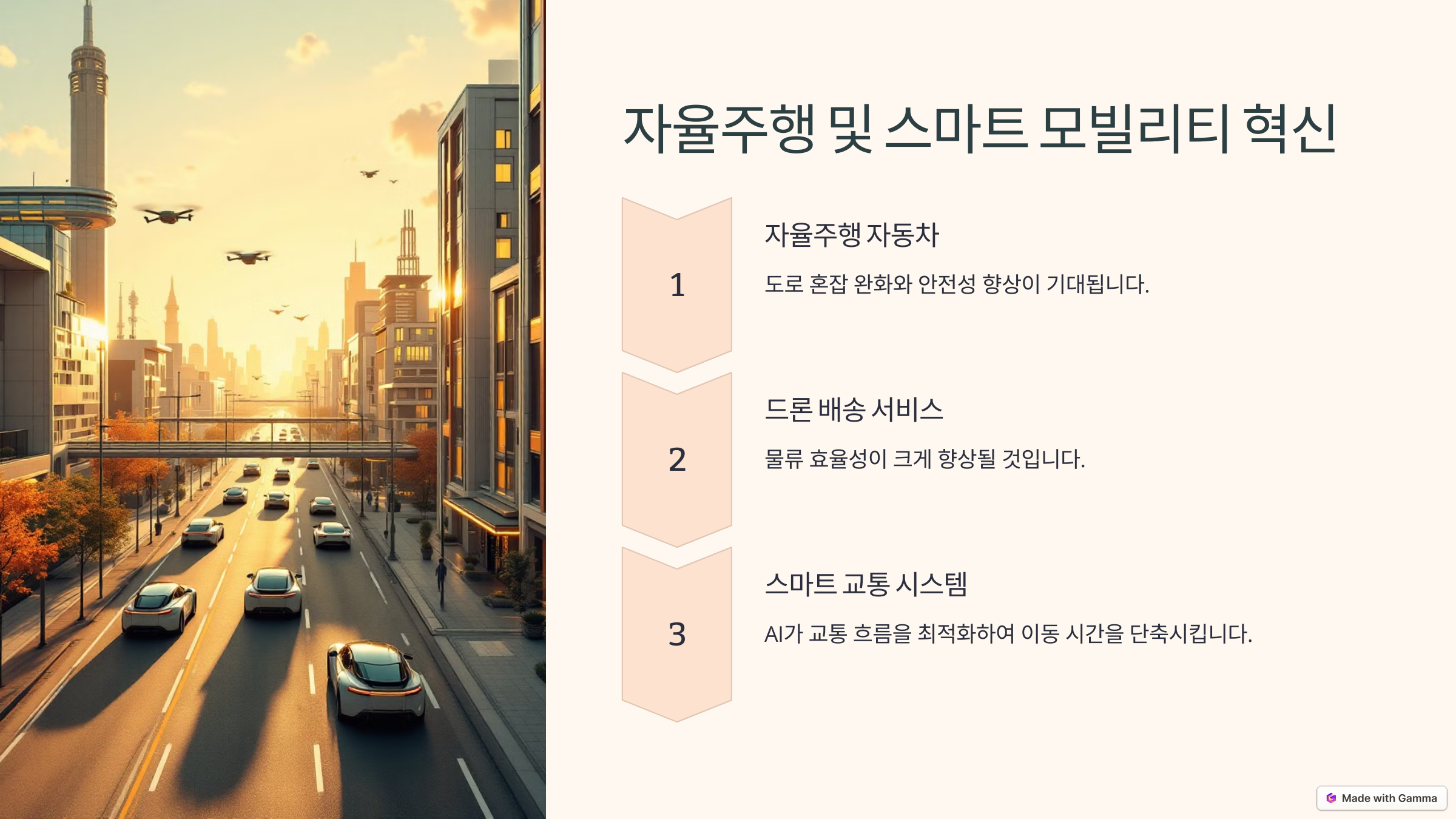 자율주행 자동차와 드론 배송 서비스가 상용화되면서 물류 및 교통 시스템이 획기적으로 변화할 것입니다. 도로 혼잡 완화와 물류 효율성이 크게 향상될 것으로 예상됩니다.