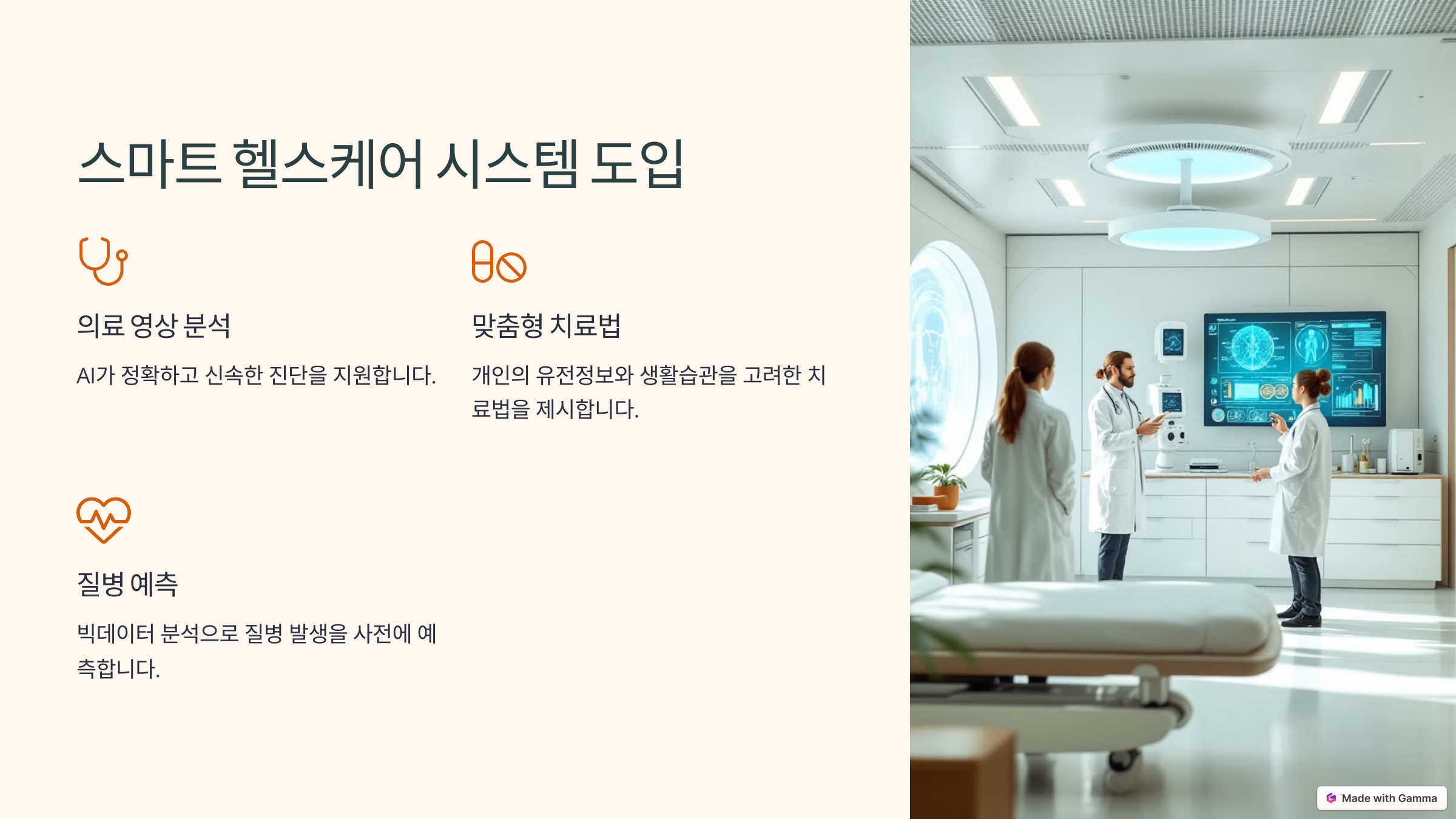 AI는 의료 영상 분석, 맞춤형 치료법 추천, 질병 예측 등 의료 분야에서 혁신을 일으키고 있습니다. 원격 진료와 개인화된 건강 관리 서비스가 일반화될 것입니다.