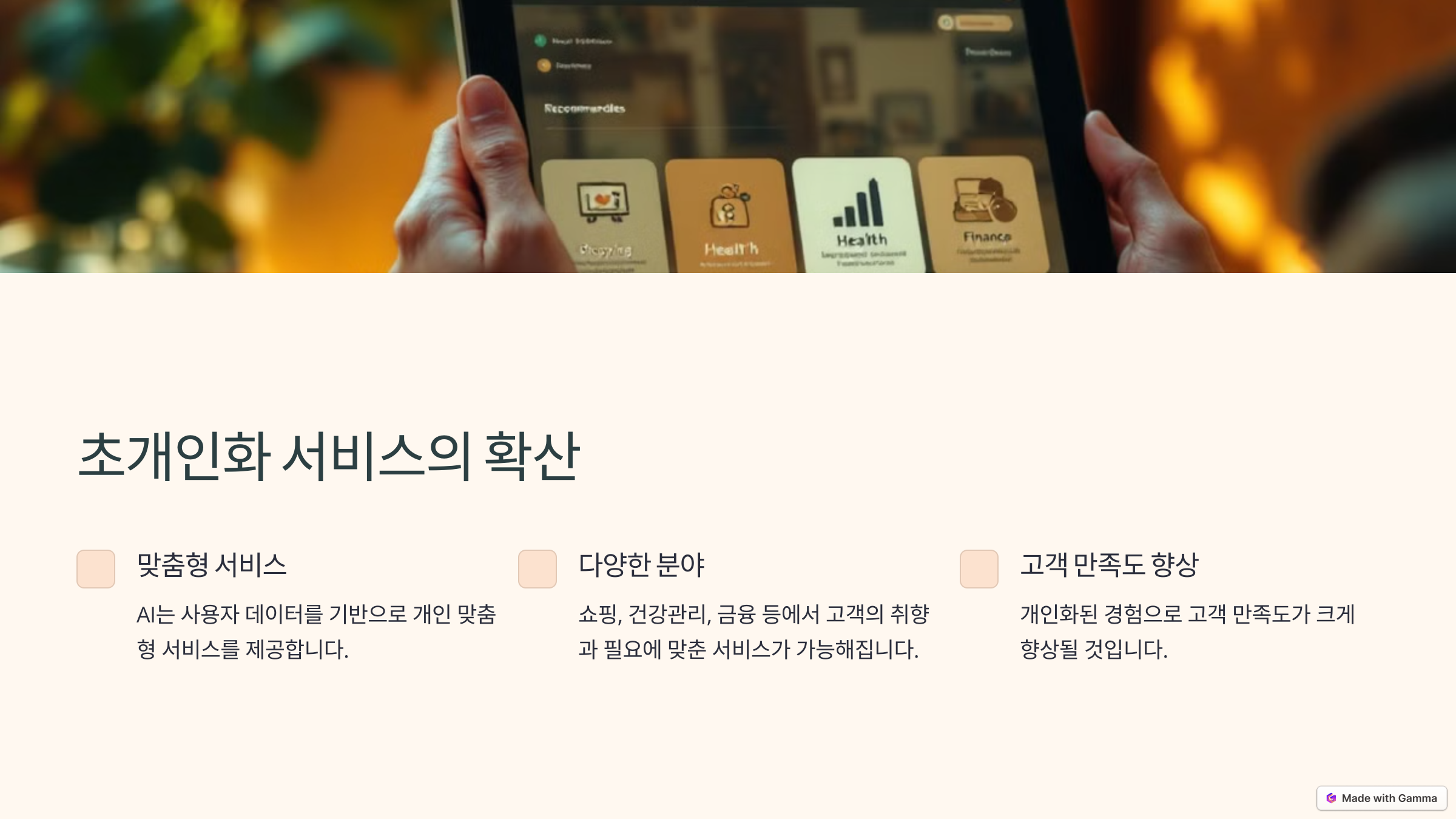 AI는 사용자 데이터를 기반으로 개인 맞춤형 서비스를 제공하는 데 탁월합니다. 이는 쇼핑, 건강관리, 금융 등 다양한 분야에서 고객의 취향과 필요에 맞춘 서비스를 가능하게 할 것입니다.