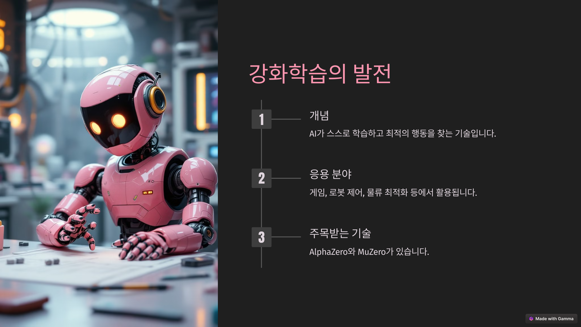 AI가 스스로 학습하고 최적의 행동을 찾는 강화학습 기술은 게임, 로봇 제어, 물류 최적화 등 다양한 분야에서 활용되고 있습니다. 최근에는 AlphaZero와 MuZero와 같은 기술이 주목받고 있습니다.